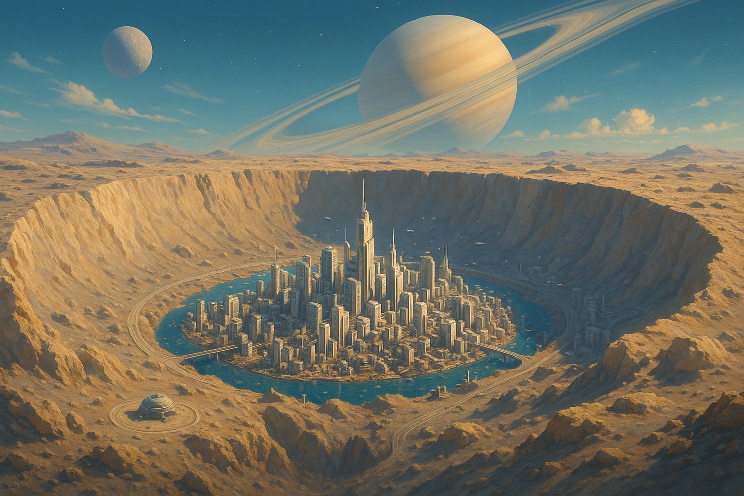 Місто в кратері ЕвріаліУ більшості зіркових мандрівників слово «кратер» асоціюється з пусткою: пил, тріщини в скелях, відлуння метеоритних ударів. Але в системі Евріалі ця асоціація не працює. Тут кратер — це не шрам, а колиска. Колиска міста, що навчилося жити у тіні астероїдних стін і перетворило порожнечу на простір для світла. Місто в кратері Евріалі — це історія не про виживання, а про вперту, майже вперту радість існування всупереч усім умовам. Воно народилося на межі між тишею космосу і шурхотом систем жизнепідтримки, між холодом вакууму і теплом штучних сонць, між страхом ізоляції та сміливістю тих, хто погодився назвати цей кам’яний колодязь домом. Кратер як природна фортеця і сцена для містаЕвріалі — астероїд неправильної форми, з орбітою, яка перетинає танцювальні траєкторії кількох більших тіл. Для більшості картографів він був би просто ще однією нерівною брижею каменю в чорному морі. Та один його кратер змінив усе. Цей кратер не був найбільшим чи найглибшим у поясі астероїдів. Але він мав дві унікальні якості. По-перше, його стінки піднімалися майже вертикально, утворюючи природну чашу, що захищала внутрішній простір від прямих потоків мікрометеоритів. По-друге, його форма створювала ідеальну тінь: на дні майже ніколи не було прямого сонячного проміння, що дозволяло легше контролювати температурні коливання. Для перших інженерів, які прибули сюди в складі геологічної експедиції, це було майже одкровенням. Вони побачили не просто вирву удару, а готовий котлован для міста. Потрібно було «лише» закрити небо, провести каркаси, наповнити це місце повітрям і світлом. Тут, у темному серці Евріалі, виникла ідея міста-кратера — урбаністичного експерименту, де архітектура не бореться з ландшафтом, а вростає в нього, як мох у тріщини старих скель. Купол над порожнечею: як з’явилася штучна небесна сфераПерший етап будівництва міста в кратері був, по суті, актом створення нового неба. Над кратером натягнули багатошаровий купол, що з боку здавався прозорим, але насправді складався з десятків тонких оболонок: енергетичних полів, металізованих плівок, нанокомпозитних решіток. Цей купол виконував одразу кілька ролей. Він утримував атмосферу, фільтрував радіацію, підтримував стабільну температуру, а головне — ставав екраном для штучного дня і ночі. У нижніх шарах купола розмістили мікропроєктори та пласкі сонячні панелі, які одночасно були і джерелом енергії, і інструментом для малювання неба. Міські програмісти-астрономи створили цілу бібліотеку небесних сценаріїв. Згодом у мешканців міста з’явилася традиція: кожен новий рік обирати «небесну тему» — головний сценарій на наступні дванадцять місяців. Так купол став не тільки інженерною конструкцією, а й спільним полотном пам’яті. Архітектура, що росте зі скеліКоли атмосфера була стабілізована, саме місто почало рости від дна кратера вверх, до стін. На відміну від багатьох космічних станцій, що нагадували модульні контейнери, тут усе з самого початку проектувалося як єдине живе тіло. Перші будівлі були врублені прямо в скельні стінки кратера. Їхні фасади виглядали як світлові нішеві аркади: темний камінь, прорізаний рядами вікон, між якими тягнулися тонкі мостики. Внизу залишали простір для центральної площі — майбутнього серця міста, де мало перетинатися все: транспо