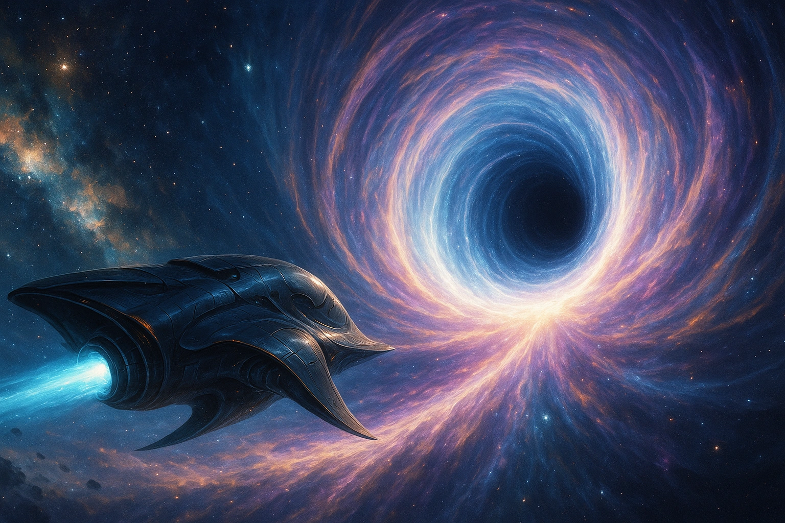 Офіційно експедиція отримала назву «Хроноперехід-7». Неформально усі називали її просто: Політ у Зворотний Всесвіт. Коридор переходу: де час стає м’якимЩоб потрапити до Зворотного Всесвіту, було недостатньо просто долетіти до Зворотнього Берега. Це була лише межа, де реальність починала «просочуватися». Теоретики запропонували вирішальну ідею: створити хронокоридор — область, де стріла часу поступово втратить жорстку напрямленість. Не просто тунель у просторі, а своєрідну «сіру зону» між «перед» і «після». «Ластівку Межі» оточили кільцями пристроїв, які працювали не як звичні двигуни. Вони не штовхали корабель уперед, а перебудовували саму тканину подій навколо нього. Це було схоже на те, як у річці можна створити тиху заводь, де течія сповільнюється й закручується у вир. Коли корабель увійшов у хронокоридор, екіпаж відчув це не стільки сенсорами, скільки шкірою свідомості. Спершу з’явилися дрібні дивності: