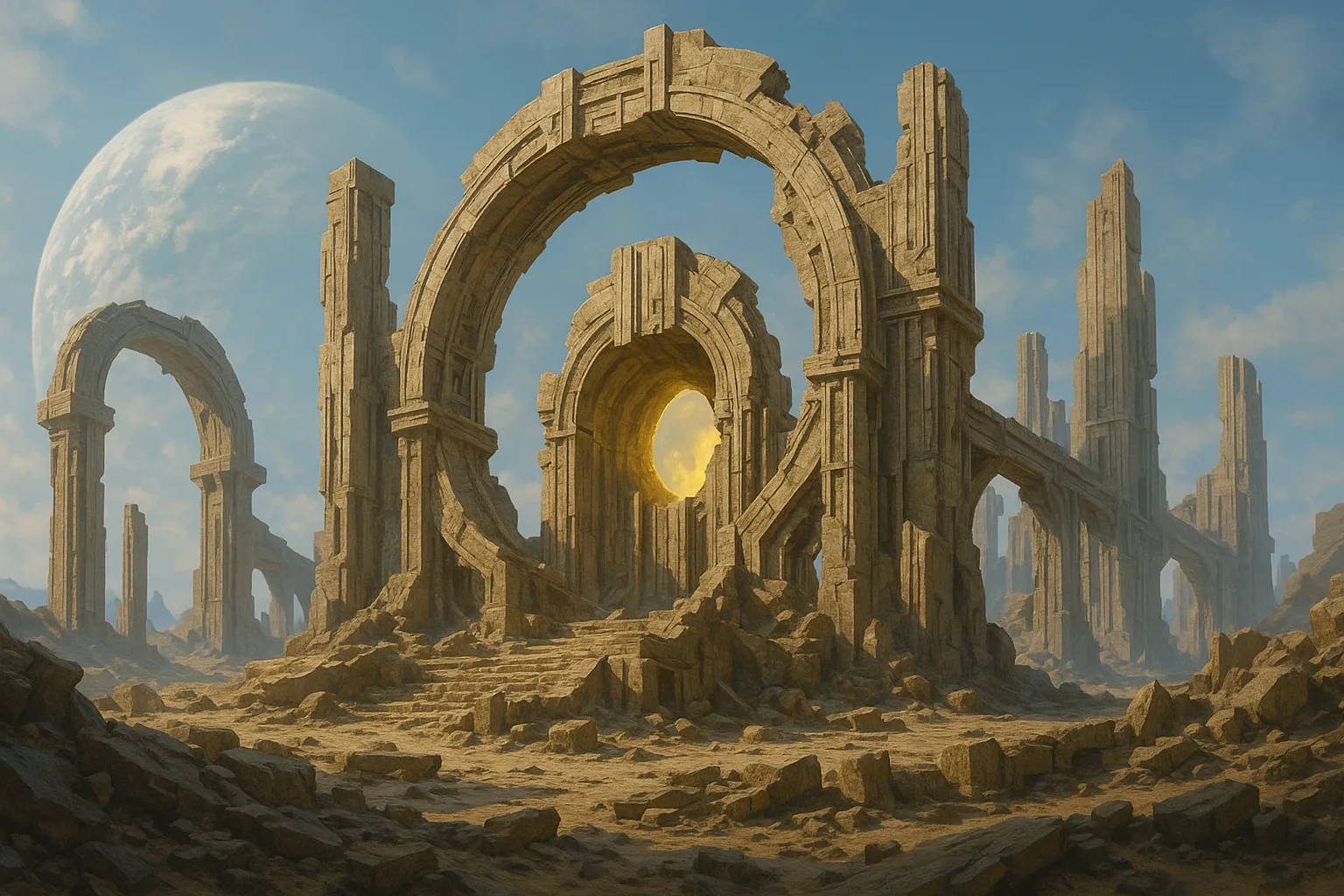 Руїни першої мегаструктуриПролог: коли сама орбіта — це пам’ятникУ «Хроніках Забутих Галактик» є історії про імперії, що палали, як наднові, про міста, збудовані на кометах, про цивілізації, які навчились жити всередині чорних дір. Але є історії, що стоять над усіма ними — історії про ті моменти, коли розум вперше наважився вийти за межі «планета–орбіта–станція» й спробував збудувати щось, що змагалося б із самою архітектурою космосу. Саме до таких історій належить легенда про першу мегаструктуру. Не просто великий об’єкт, не просто кільце, пояс чи сферу. А спробу взяти зорю, гравітацію, світло й темряву і зробити з них єдиний механізм. Сьогодні від неї залишилося те, що археологи космосу називають «скелетом орбіти». Руїни, розкидані на відстані кількох астрономічних одиниць, чорні уламки, мов застиглі блискавки, та тихе випромінювання, яке не підкорюється жодним відомим циклам. Ми не знаємо, хто її збудував. Відкриття в темному поясіПершими її знайшли не знавці давнини, а звичайні мандрівні картографи, що оновлювали карти далекого сегмента рукава. Їхній корабель «Геліоскоп-7» рухався крізь регіон, який у звітах позначався як «темний пояс»: зона, де щільний пил, тьмяні карлики й відсутність потужних маяків робили навігацію справою терпіння, а не точності. Спершу вони подумали, що зіткнулися з черговою покинутою орбітальною мережею. Сенсори зафіксували рівномірний пояс об’єктів на майже ідеальній круговій орбіті навколо тьмяної зорі другого покоління. Але вже перший детальний аналіз розбив цю гіпотезу. Уламки були занадто великими. «Геліоскоп-7» передав дані до Центрального Архіву Археології Космосу, і той загудів, як розбуджений вулик. З усіх куточків галактики почали підтягуватися експедиції: автономні зонди, важкі дослідницькі кораблі, приватні команди мисливців за давниною. Так руїни безіменного кільця отримали свою першу назву: ПЕРША МЕГАСТРУКТУРА, з великої літери, без уточнень, ніби все інше — лише варіації на тему. Скелет над зіркою: анатомія неможливої спорудиКоли були нанесені перші тривимірні карти, картина вразила навіть тих, хто бачив зіркові фортеці й штучні кільцеві світи. Навколо тьмяної зорі, схожої на виснажене сонце, простягався широкий пояс уламків на майже ідеальній орбіті. Аналіз траєкторій показав: колись це була не просто розсипка об’єктів, а цілісна конструкція, що огортала зорю майже повним кільцем. Діаметр — більший, ніж орбіта давньої Землі. Уявити собі завершений вигляд цієї споруди — значить спробувати побачити в голові горизонт, який згинається у кільце й ніколи не закінчується. Це був не Світо-кільце, придатне для життя, і не повна зоряна оболонка. Це було щось проміжне: гігантський колектор, обчислювальна решітка, платформа для ще чогось, чого ми досі не розуміємо. Матеріал уламків виявився ще більш дивним, ніж їхня форма. Сплави, яких у нашому періоді Всесвіту не створюють: Археологи жартували, що це — не руїни будівлі, а рештки тіла. І що колись над цією зорею жила споруда, яка більше нагадувала організм, ніж споруду. Мова металу і вакуумуКласична археологія має справу з написами на камені, керамічними фрагментами, візерунками на стінах. Археологія космосу працює з іншими шарами: радіошумами, спектральними слідами, статистичними узорами у розподілі уламків. Руїни першої мегаструктури