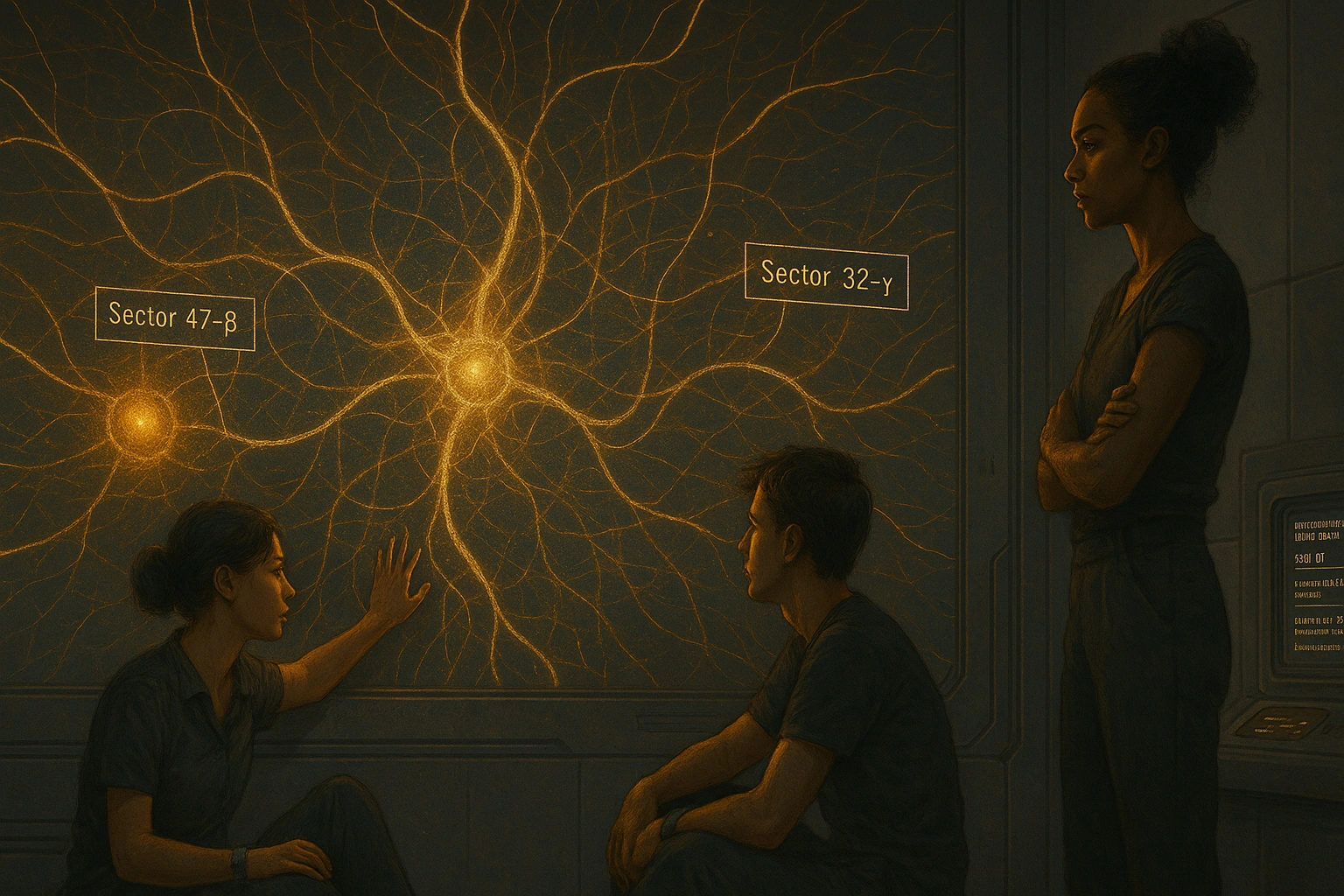 Народжені на стиках галактик — частина VIIIПерший узгоджений хорОфіційне повідомлення прийшло так буденно, що від цього ставало тільки тривожніше. ПІДТВЕРДЖЕННЯ ПРОТОКОЛУ: ХОР-01 Рядки повільно прокотилися по верхньому борту екрана в спільній кімнаті дітей швів. Ні сирен, ні червоних маячків, ні навіть зміни тону в голосі автоматичного оголошувача. Лише суха констатація: сьогодні їхній хор офіційно стає частиною операції. — «Контрольований ризик», — протягнув Орен, сидячи на краю стола й розгойдуючи ногою. — Обожнюю, як вони це формулюють. Наче хоч раз щось тут було по-справжньому контрольованим. Д-р Сів стояла біля стіни, притулившись лопатками до холодного металу панелі. Здалеку могло здатися, що вона просто втомилася, але Ліра вже навчилася розрізняти: це була та особлива напруга, коли людина не дозволяє собі втратити рівновагу тільки тому, що ще не встигла доробити заплановане. — Це мала корекція, — сказала Сів, переглядаючи дані на своєму планшеті. — Без удару, без циркуляційного розриву. Перешивач тільки перерозподілить напругу на ослабленій ділянці. За розрахунками, без вас він теж впорався б. Але… Вона підняла очі. — …але після того, що сталося з 47-β, ніхто більше не хоче робити вигляд, що хор — просто шум. Тому вас офіційно додають як стабілізуючий контур. — Тобто нас офіційно попросили… не панікувати разом? — сухо уточнила Наїра. — Вас офіційно попросили співати строго за схемою, — відповіла Сів. — І водночас — дати вам мінімум того, що ви вимагали. Доступ до карти. Принаймні в межах цієї операції. Слово «карта» в кімнаті ніби змінило густину повітря. Багато років вони жили всередині шва, чули його, відчували, інколи бачили уривки графіків, які їм показували як «роз’яснювальний матеріал». Але повну картину — те, як мережа виглядає для перешивача, для дирекції, для архіву А-0, — їм досі не показував ніхто. — Це буде справжня конфігурація? — запитала Ліра. — А не ще одна «навчальна схема» з красивими кольорами й без небезпечних ділянок? — Це буде конфігурація, яку А-0 готовий показати вам як «допущеним до спільних операцій», — відповіла Сів. — Повної прозорості вони вам, звісно, не дадуть. Але це вже не обрізки. Вона легенько торкнулася панелі біля дверей. Світло в кімнаті злегка згасло, перейшовши в м’який, розсіяний режим. Матова обшивка стін, звична й майже непомітна, раптом ожила легким світінням. По ній попливли тонкі лінії, спершу хаотичні, а потім — зібрані в чітку структуру. Мережа швів проступала прямо на стінах. Це не було зображенням у звичному сенсі. Не «карта з позначками», а скоріше живий зріз поля. Вузли сяяли різною інтенсивністю; шви тягнулися між ними, утворюючи кільця, спіралі, кілька дивних «пелюсткових» структур, які перетиналися в особливих точках. — Ого… — вирвалося в Оренa. — То ось як ми виглядаємо з їхнього боку. — Це — лише частина, — тихо промовила Наїра. — Але все одно… Вона простягнула руку й, не торкаючись стіни, повела пальцями вздовж однієї з ліній. Проекція відреагувала: локальний фрагмент карти збільшився. Десь на периферії кільце стало прозорішим, відсунулося, відкриваючи нижній шар — резервні шви й компенсаторні петлі. — Сектор 47-β, — сказала Сів, позначаючи один із вузлів. — Тут ви живете. І тут сталася остання атака. 47-β світився не яскравіше за інші, але колір його був трохи густішим — н