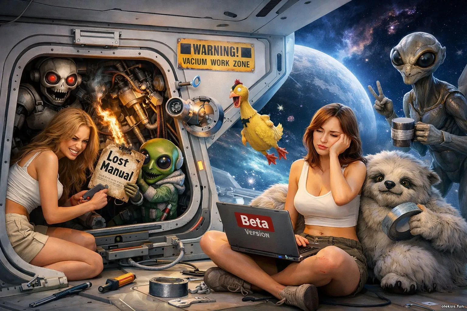 Космічний “сервісний люк” у вакуумі й під дедлайном: дівчата разом із неземними істотами ремонтують корабель у режимі «бета-версії», бо інструкція безслідно загубилась.