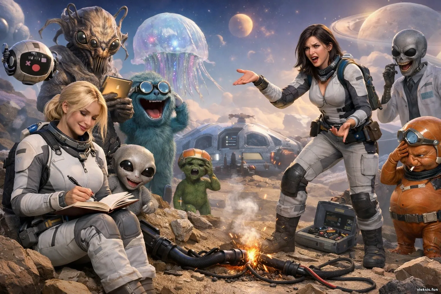 Експедиція в «нульову тінь» починається з класики: щоденник працює як сліпий радар, ШІ регоче в логах, а винен — звісно — кабель. Дівчата намагаються зібрати техніку до купи, поки неземні «свідки» з цікавістю (і трохи зловтіхою) спостерігають за ремонтом серед космічних пейзажів.