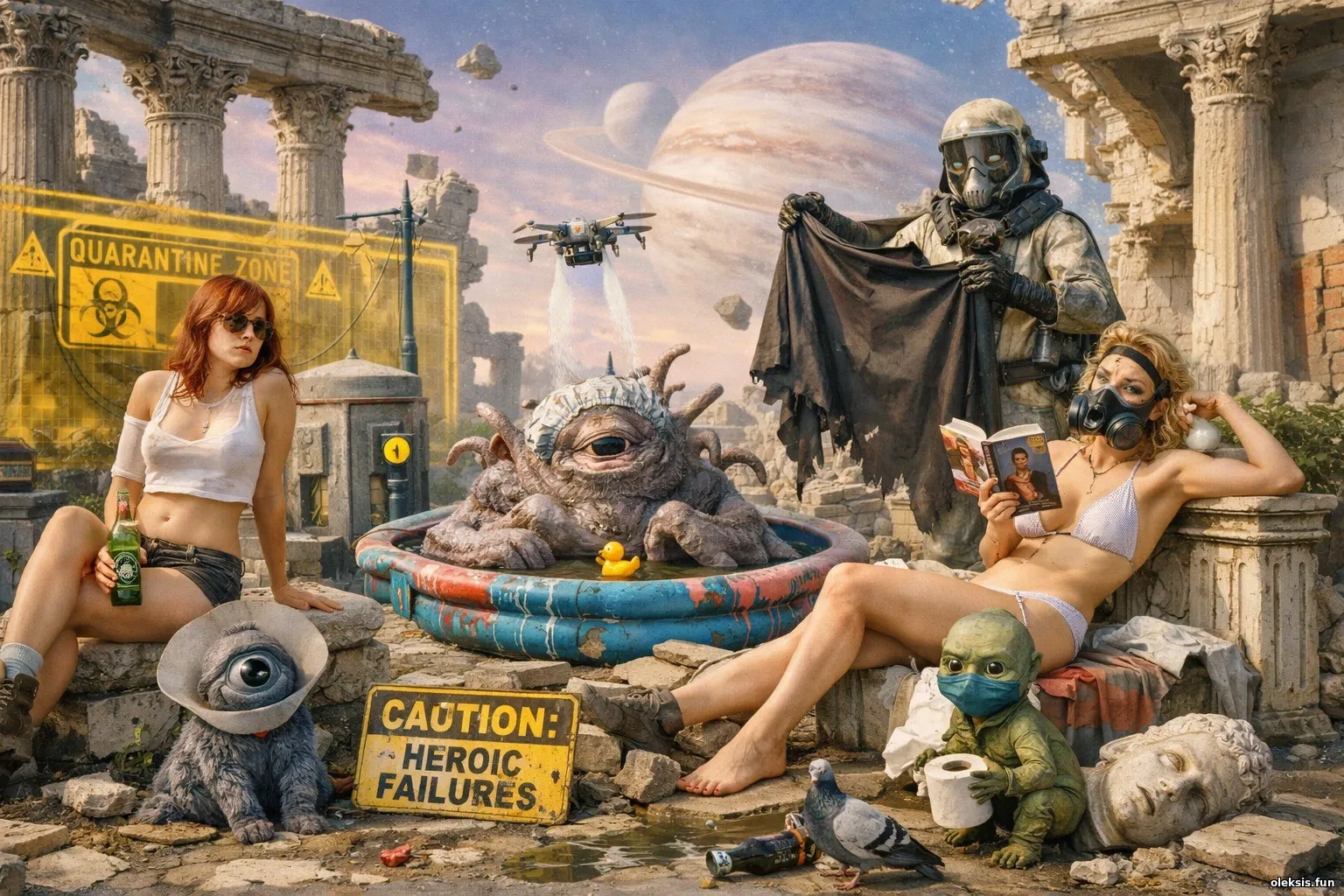 У кадрі — шляхетна руїна космічної карантинної зони, де пафос давно зламав собі підбори об уламки колон. Дві героїні, схожі на останніх свідків чужого абсурду, позують серед неземних істот і декоративного хаосу так, ніби рятівник ось-ось з’явиться, але знову десь заблукав. Світлі барви, м’яке 3D-світло й іронічний настрій перетворюють цю сцену на саркастичний портрет галактичної пристойності, що тримається буквально на чесному слові. І, як видно, герой тут справді був — лише надто делікатно втік.