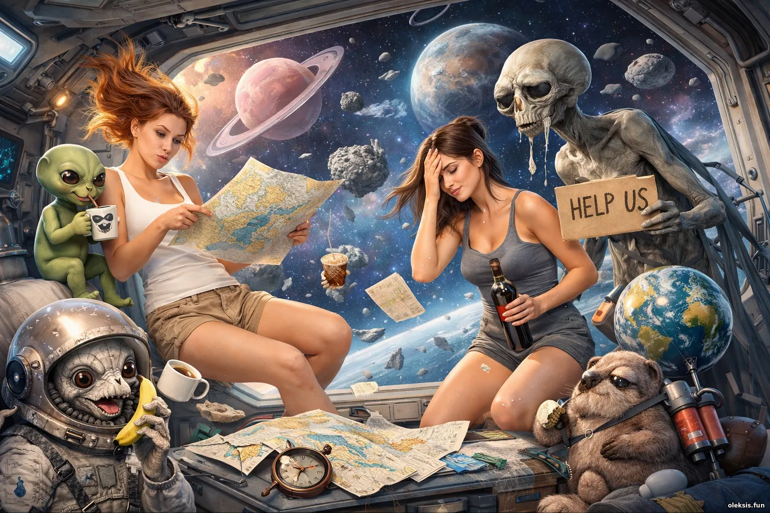 У кадрі панує космічний безлад із присмаком сарказму: дві дівчини зависли серед фальшивих мап, втомленої гравітації та неземних істот, які, схоже, теж уже не вірять у навігацію. Світлі відтінки, багатошарова 3D-композиція й барвистий вакуум створюють ефект дорогої ілюзії, де сама реальність продається зі знижкою. Це сцена про втому, абсурд і красу космосу, який традиційно обіцяє більше, ніж може пояснити.