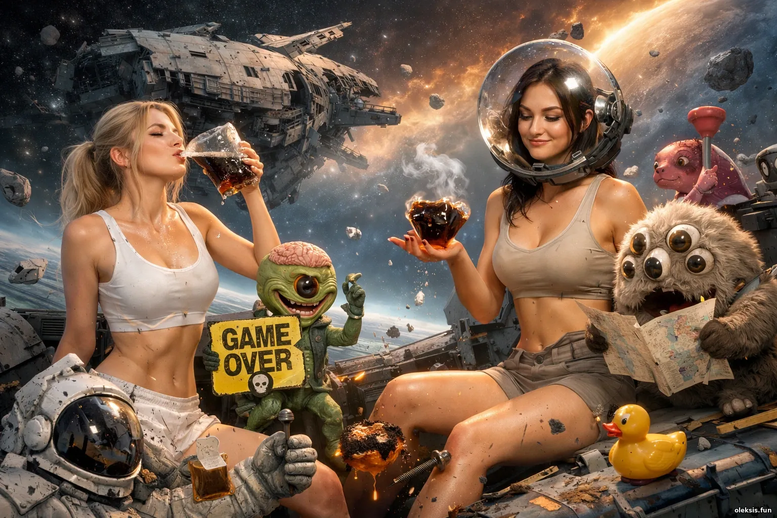 У безмежному вакуумі, де здоровий глузд давно вийшов у шлюз без скафандра, дві дівчини спокійно влаштували чаювання серед уламків корабля, що, очевидно, вже нікуди не повернеться. Поруч — неземні істоти з виразами облич, ніби вони теж не читали план евакуації, бо його просто не існувало. Світлі барви, космічний абсурд, трохи сарказму й чорного гумору створюють сцену, в якій катастрофа виглядає майже святково. І навіть чай тут подано без кружки — строго за стандартами міжзоряного безладу. Авжеж!
