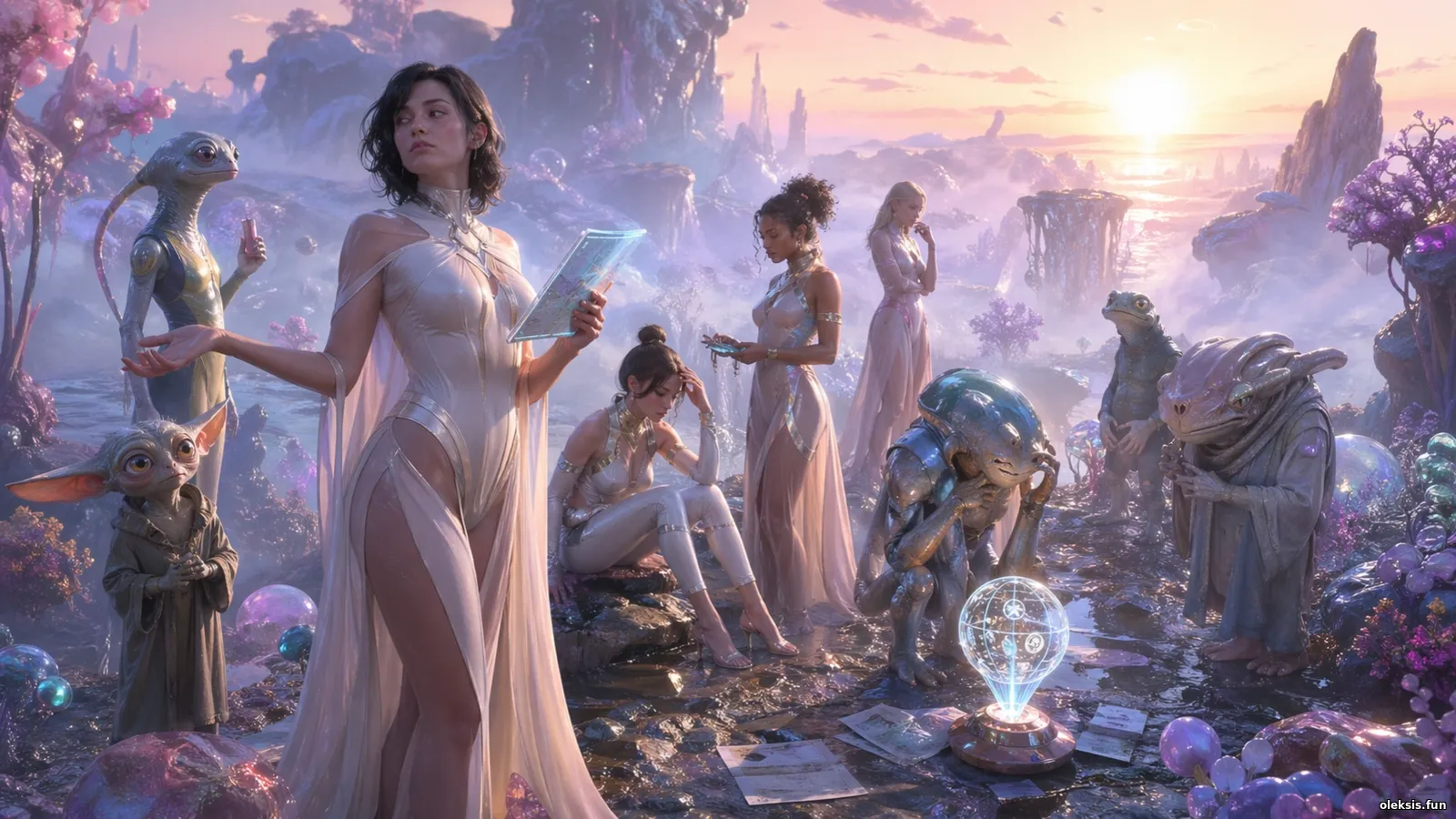Кадр 02 занурює у туманний світанок чужої планети, де світло, здається, саме передумало, куди падати. Дівчата в елегантному футуристичному вбранні та неземні істоти стоять серед сяйва, мап і дивних приладів, ніби щойно звернули не туди. Атмосфера поєднує красу космічного архіву, легкий абсурд, чорний гумор і майбутні виправдання, які вже пишуться просто в кадрі.
