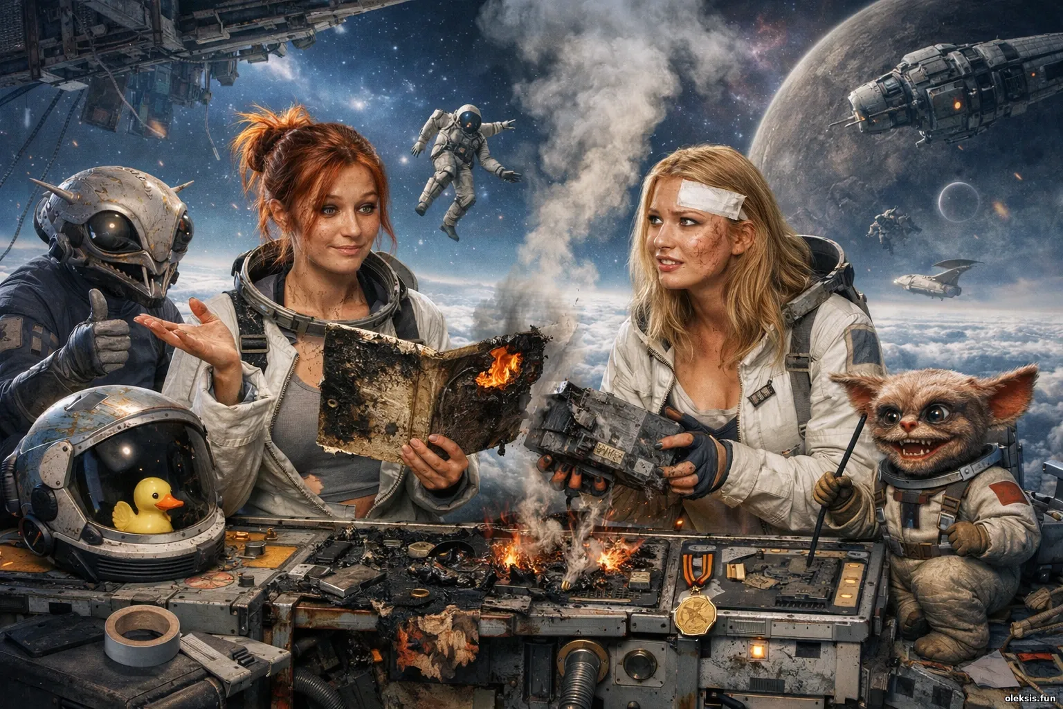 На орбіті над планетою з «вимкненим небом» дві дівчини розбирають обвуглений модуль пам’яті, намагаючись відновити дані з явними слідами героїзму. Поруч неземні істоти спостерігають із ввічливим жахом і мімікою «ми ж казали читати інструкцію». Дим, іскри та уламки станції натякають: хтось рятував світ, але загубив мануал і тепер імпровізує.