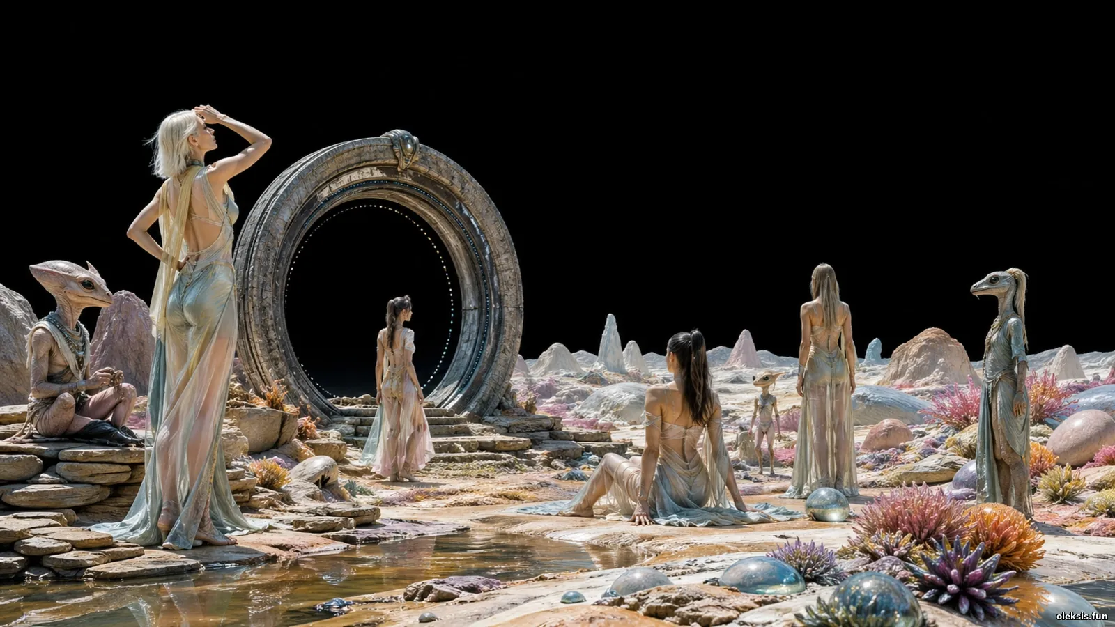 На планеті з вимкненим небом кілька загадкових дівчат і неземних істот завмерли біля стародавнього порталу, що відкриває не шлях, а бездоганно чорне «нікуди». Світла поверхня, кристали, дивні рослини й холодний блиск води контрастують із небом, яке після перезавантаження так і не згадало, що має існувати. Атмосфера поєднує космічну красу, тишу катастрофи та сухий сарказм архіву, де темрява нарешті отримала головну роль.