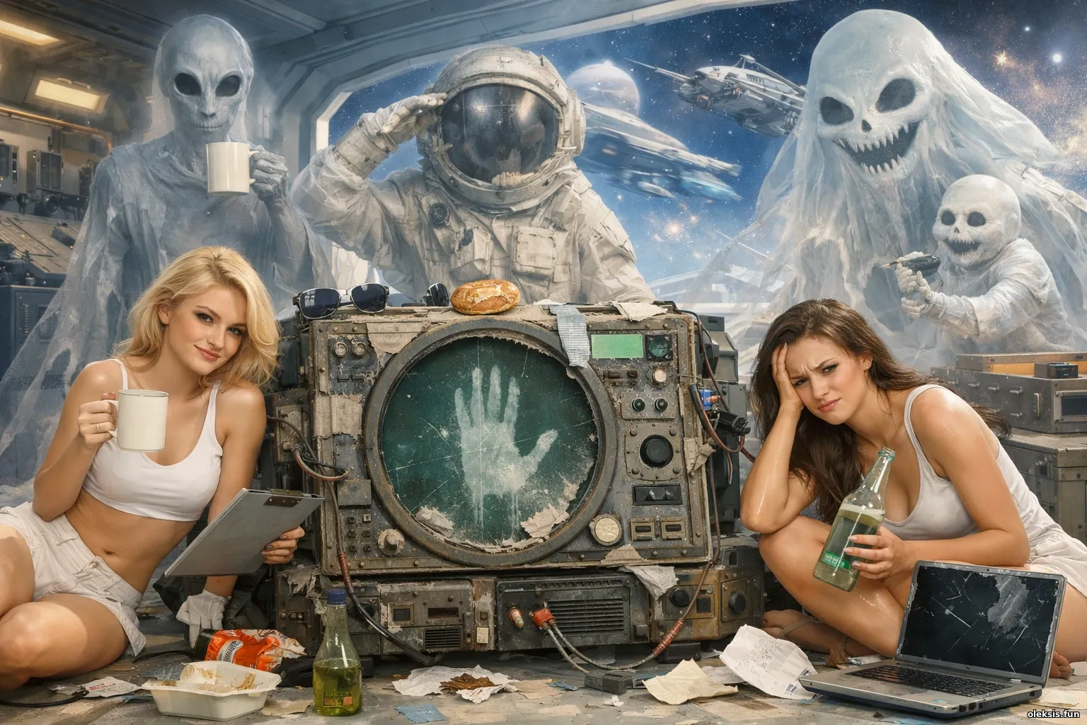 У кадрі — примарна сцена з космічного архіву, де втомлені, але іронічно незворушні дівчини позують серед старої апаратури, привидів флотилій і неземних істот. Світлі відтінки, об’ємна 3D-естетика та широкий формат створюють відчуття химерної краси, ніби аварійний рапорт давно прострочений, а сліпий радар усе ще вперто фіксує те, чого ніхто не мав бачити. Атмосфера балансує між сарказмом, чорним гумором і загадковим космічним абсурдом.