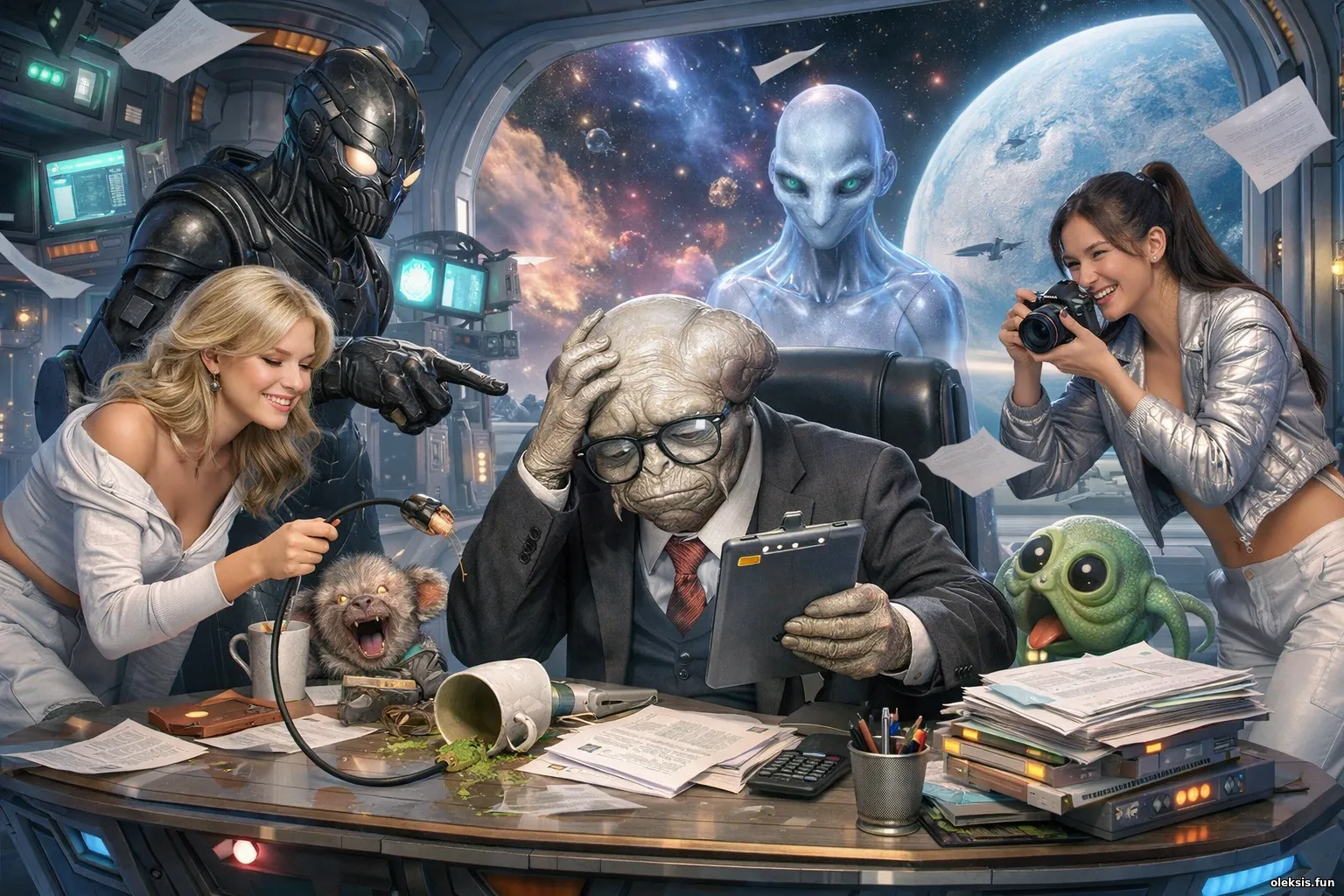 У кадрі — момент космічного контакту, який знову зірвався через дрібницю, гідну міжгалактичної бюрократії: кабель, світло і чиєсь фатальне «та воно ж працювало». Дві дівчини опиняються серед неземних істот у сяйві холодних відтінків і стерильної зоряної величі, де урочистість першої зустрічі швидко перетворюється на абсурдний службовий інцидент. Реалістична 3D-сцена поєднує красу контакту, іронію ситуації та легкий чорний гумор.