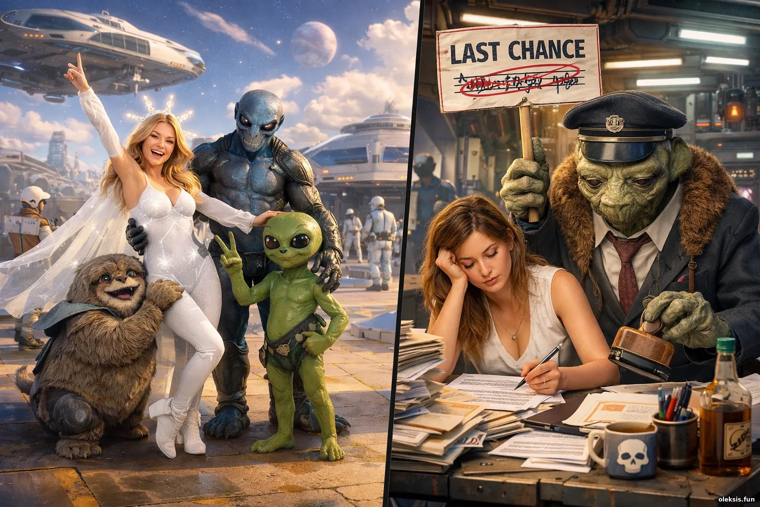 На тлі сяйливого космодрому, де посадки давно стали сумішшю дива й канцелярського абсурду, зустрічаються краса, втома й інопланетна рутина. Усміхнені дівчата, химерні неземні істоти та зорельоти створюють яскраву сцену, яку псує лише бюрократ із поглядом істоти, що давно підписала забагато безглуздих форм. Легка іронія, м’який чорний гумор і відчуття, що це “останній раз”, тут сяють майже так само яскраво, як і зорі.