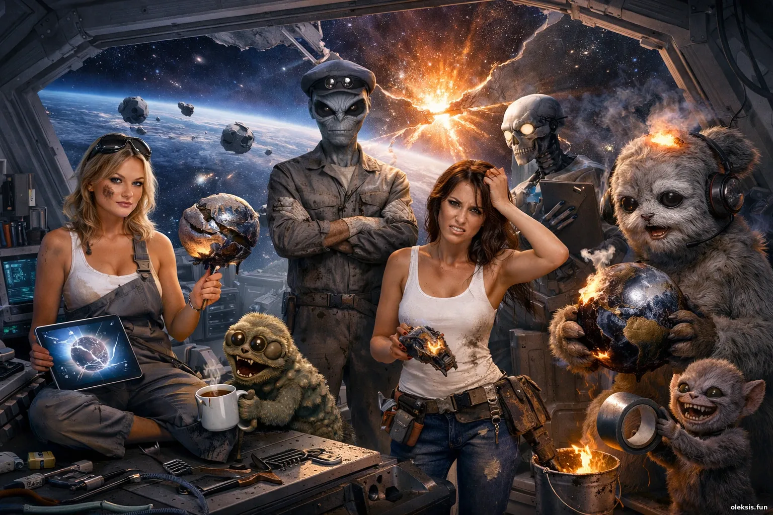 Нічний контроль якості “ремонту всесвіту”: дві втомлені майстрині та неземні істоти серед інструментів і іскор перевіряють космічний “до/після” — за секунду до неминучих вибачень.