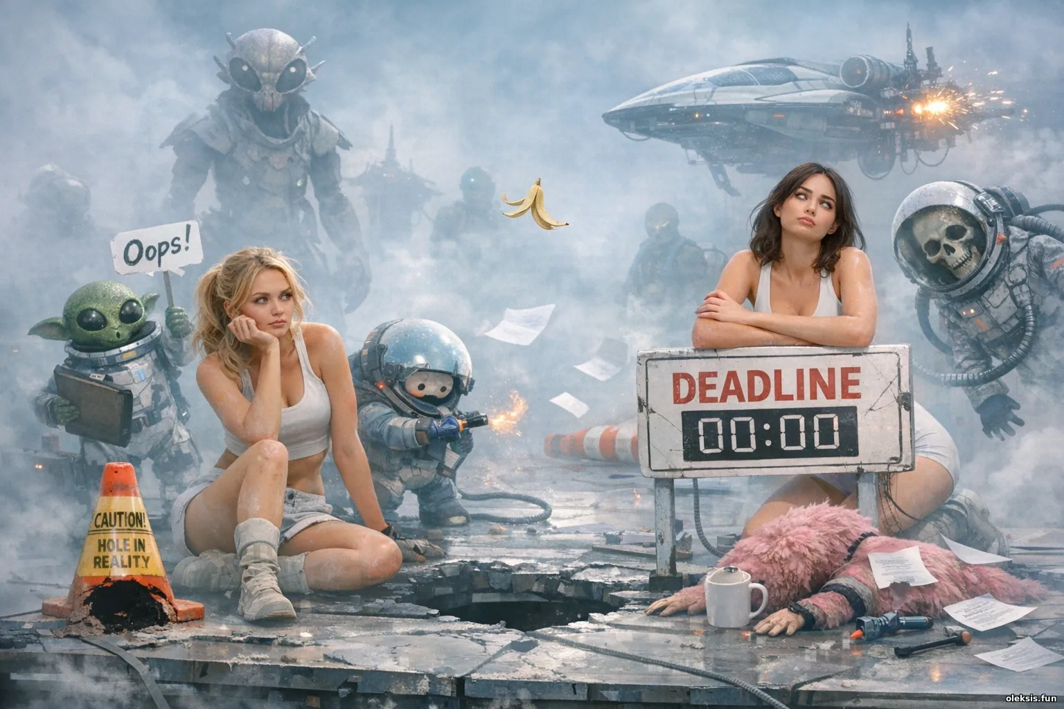 У густому тумані аварійного плацдарму, де вакуум і дедлайни давно уклали злочинний союз, дві дівчини опиняються серед неземних істот, уламків техніки й слідів чужих помилок. Кометний пил зависає над сценою, ніби хтось вирішив замести сліди, але зробив це з типовою космічною недбалістю. Кадр поєднує світлі відтінки, 3D-глибину й тонкий сарказм: навіть у безмежжі галактики хаос виглядає напрочуд організовано.