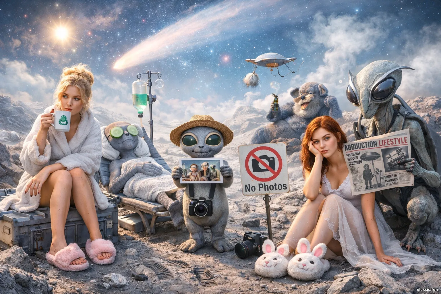 Сцена на кометі: дві дівчини в світлих тонах серед кумедних неземних істот, кометного пилу й космічних дрібниць — туман без гриму та іронічна тиша “без коментарів, як домовлялись”.