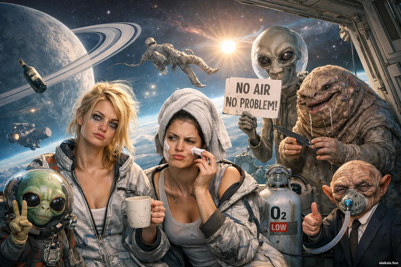 На борту орбітальної станції, де кисень цінують менше, ніж пристойність, дві землянки ведуть «дипломатію» з неземними істотами під холодним сяйвом космосу. Світлі тони, багатошарова 3D-фактура й іронічні деталі створюють сцену, де сарказм звучить голосніше за аварійну сирену. Це кадр із майбутнього, в якому макіяж зник першим, повітря другим, а лицемірство чомусь досі тримається на орбіті.