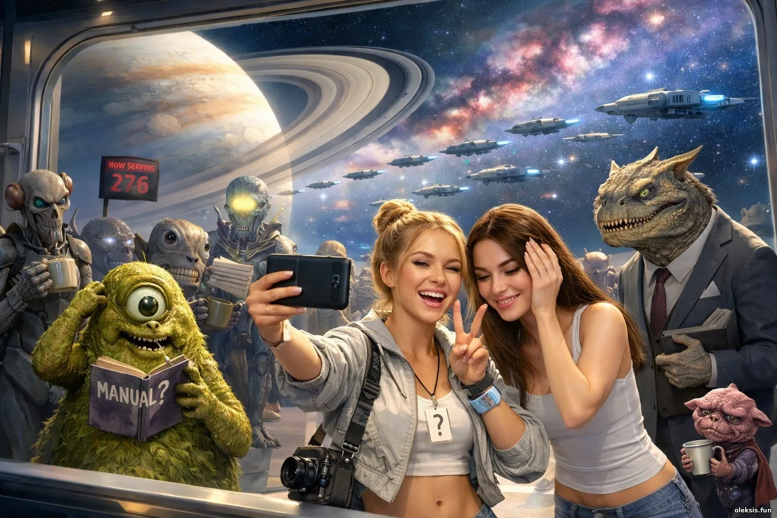 Яскрава широкоформатна 3D-сцена в космічному стилі: дві дівчини з усмішкою позують на тлі «галактичної черги» з кумедними неземними істотами та зорельотами за ілюмінатором. Світлі відтінки, багато кольорових нюансів, легкий чорний гумор і саркастичний настрій підкреслюють ідею орбіти як нескінченної бюрократичної черги до звіту.