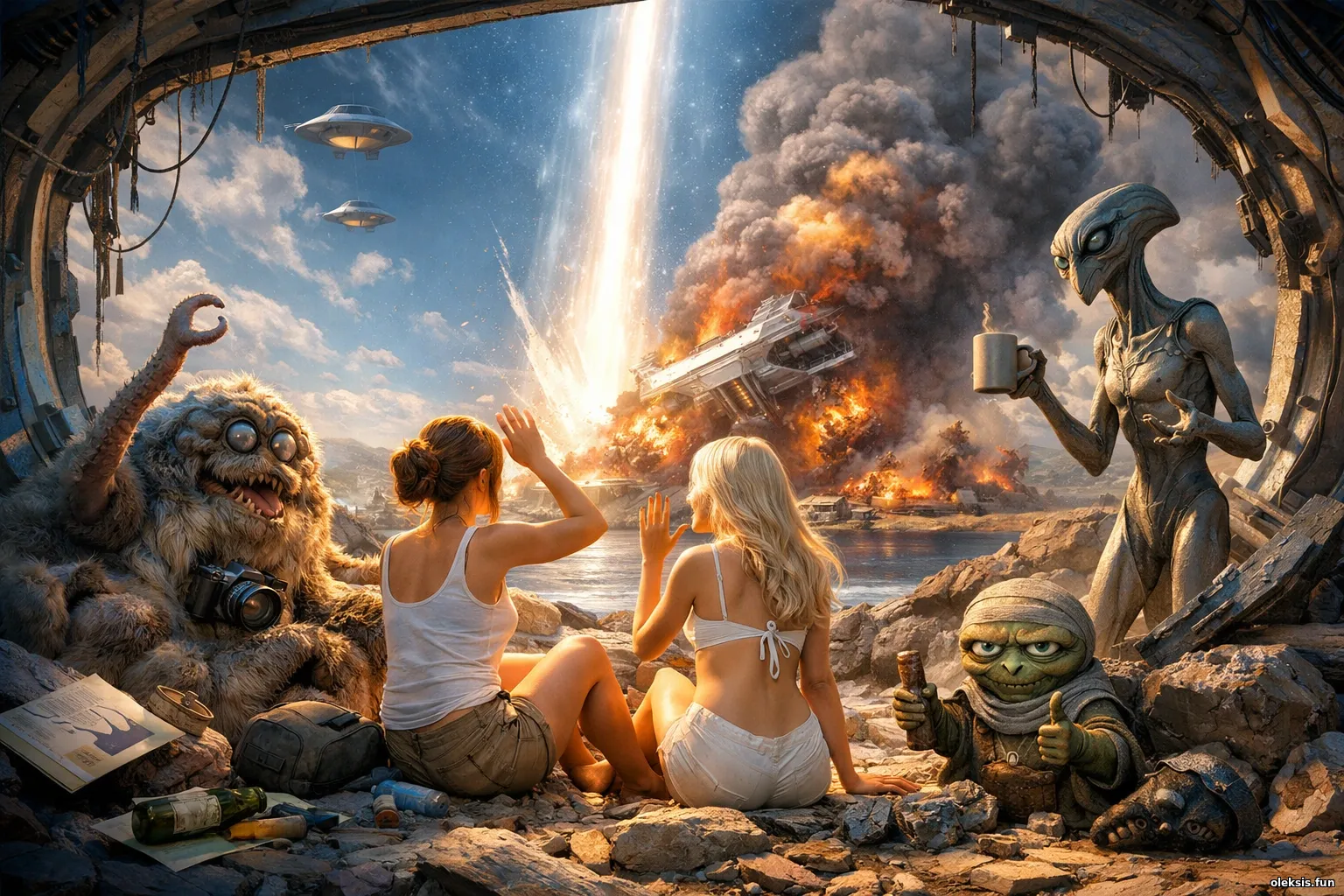 Широкоформатний кадр у світлих відтінках показує двох дівчат серед уламків іншопланетної брами, поруч із химерними неземними істотами, які спостерігають за сліпучим променем і катастрофою вдалині. Сцена поєднує красу космічного світла, тривожну мить перед новим лихом і саркастичний настрій: ніби сам Всесвіт знову запевняє, що це точно останній раз. Але всі, звісно, вже бачили, як такі обіцянки закінчуються. Світло тут не рятує — воно просто чесно фіксує момент, коли стало ще гірше. І без пафосу.