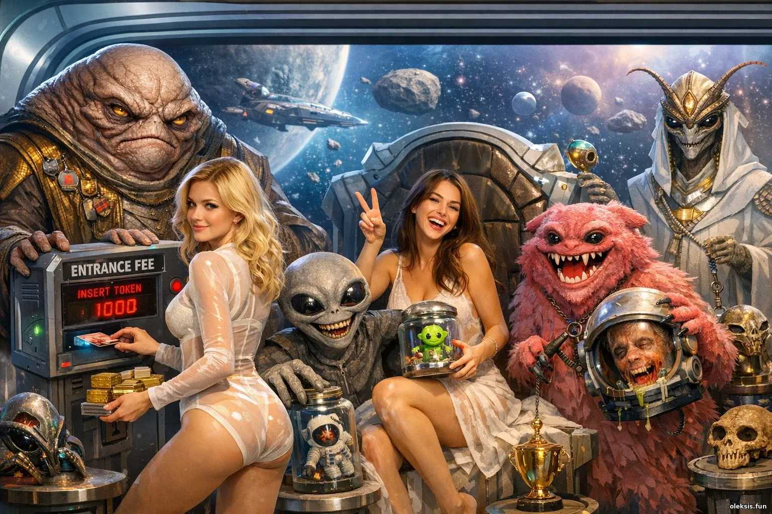 У фотоальбомі «Трофеї дипломатії в вакуумі» ця сцена виглядає як музейний експонат епохи, де здоровий глузд уже списали в архів. Усміхнені героїні позують серед неземних істот і дивних трофеїв так, ніби міжгалактичні переговори давно перетворилися на платний атракціон. Світлі відтінки, насичена 3D-фактура й легкий чорний гумор створюють атмосферу розкішного абсурду, де за ввічливість беруть комісію, а за вихід ніхто нічого не гарантує. І все це — з чарівною усмішкою та дуже сумнівною дипломатією.
