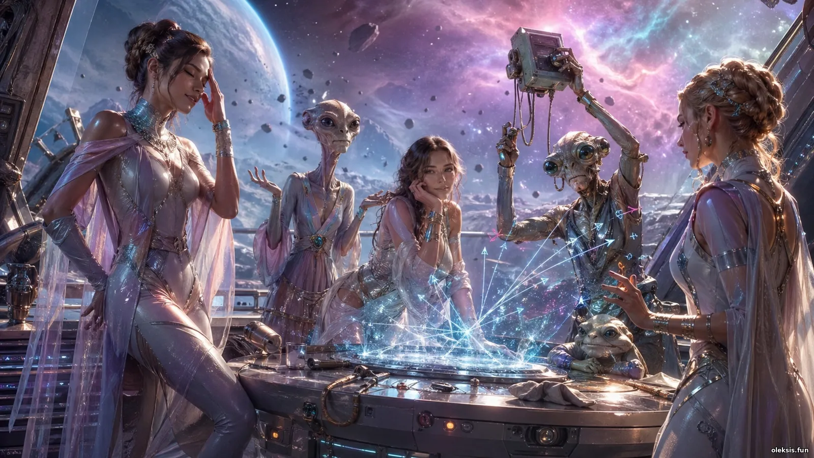 У «Космічному архіві» навігація знову вирішила образитися, тож екіпаж із дівчат і неземних істот героїчно вдає, що все під контролем. Сяйна туманність, планета за бортом, хаотична голограма маршруту й інструменти, які більше схожі на доказ паніки, створюють атмосферу красивої катастрофи. Орбіта тримається, команда старається, а Всесвіт саркастично аплодує.
