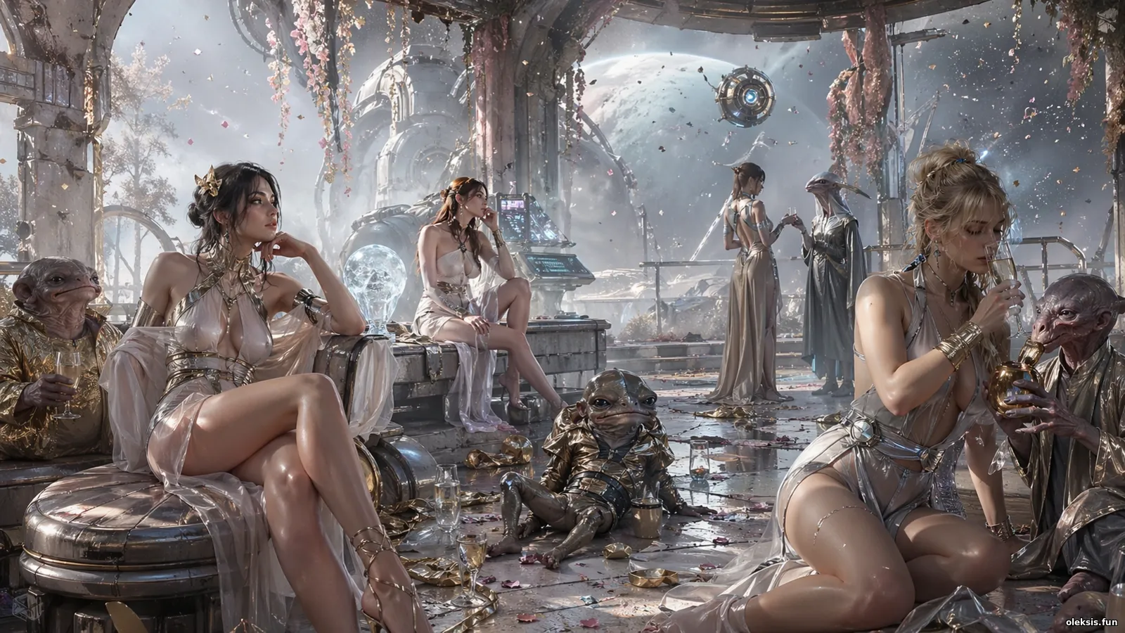 На орбітальній станції, де свято давно скінчилося, лишилися тільки втомлена розкіш, туман і дивна тиша. Серед уламків декору, келихів і згаслих сигналів сидять витончені дівчата та неземні істоти, ніби останні гості космосу, який уже не має сил удавати велич. Кадр поєднує красу, сарказм і легкий чорний гумор: навіть шляхетна руїна тут виглядає так, ніби всесвіт просто вимкнув музику й пішов без прощання. Світлі відтінки, 3D-глибина й післясвяткова меланхолія створюють ефект мовчазної орбітальної елегії.