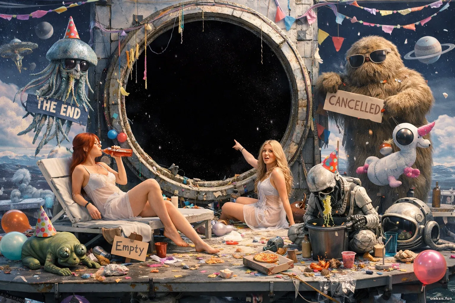 На орбітальній платформі, заваленій «залишками» свята — конфеті, кульками й порожніми стаканчиками — дві дівчини відпочивають у легких напівпрозорих сукнях. Поруч дивакуваті неземні істоти в окулярах і в ковпаках, а в центрі — кругле «вікно в нікуди»: чорний провал у космос. Абсурд досягає піку, коли робот “переїв” конфеті й сумно звітує про наслідки.